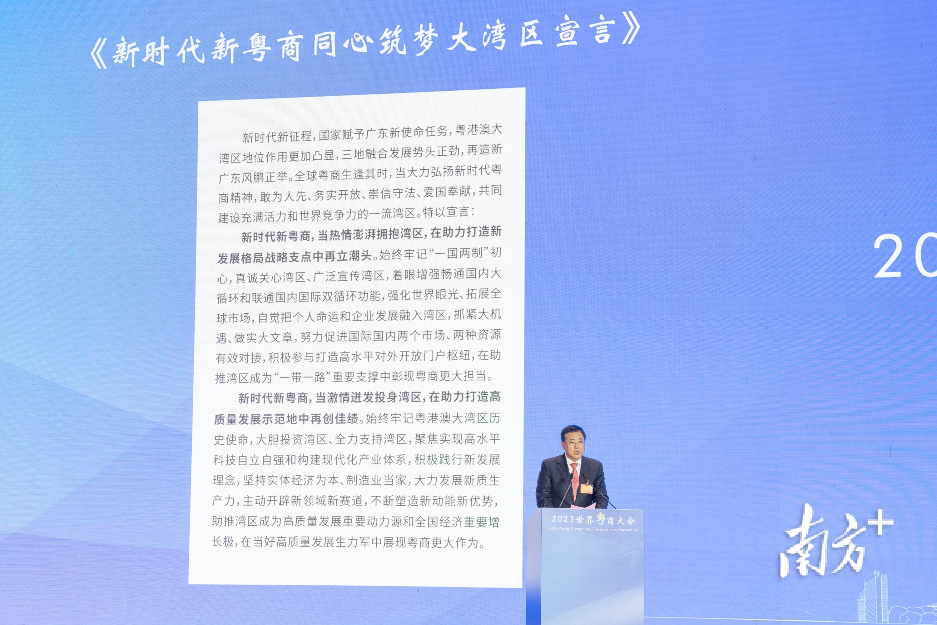2023年世界粤商大会现场宣读《新时代粤商同心筑梦大湾区宣言》。