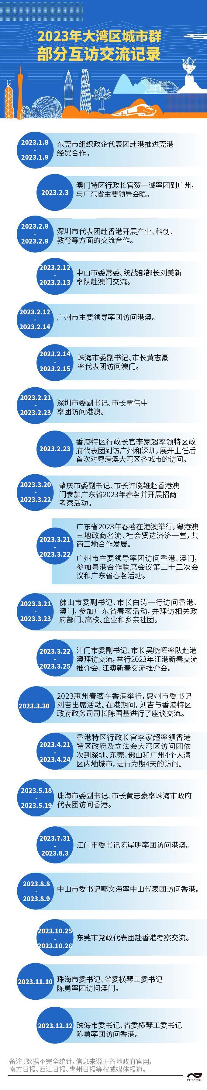 香港方面,南都大数据研究院不完全统计香港特区行政长官李家超的微博记录,2023年,他曾四次前往大湾区内地城市访问、与会等,包括深圳、广州、东莞、佛山,而且相关行程发博数量最多,占内地行程发博总数超两成。澳门方面,去年2月3日,澳门特区行政长官贺一诚率团到广州,与广东省主要领导会晤,进一步深化粤澳合作、粤港澳大湾区建设和横琴粤澳深度合作区建设等工作。