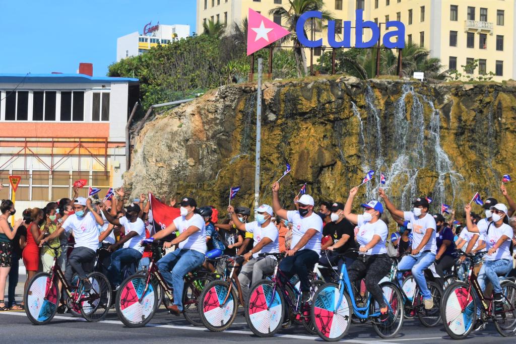 2021年8月5日,数百名古巴青年在首都哈瓦那举行保卫国家和平、团结反美游行,要求美国解除对古巴近60年的封锁。新华社发(华金·埃尔南德斯摄)