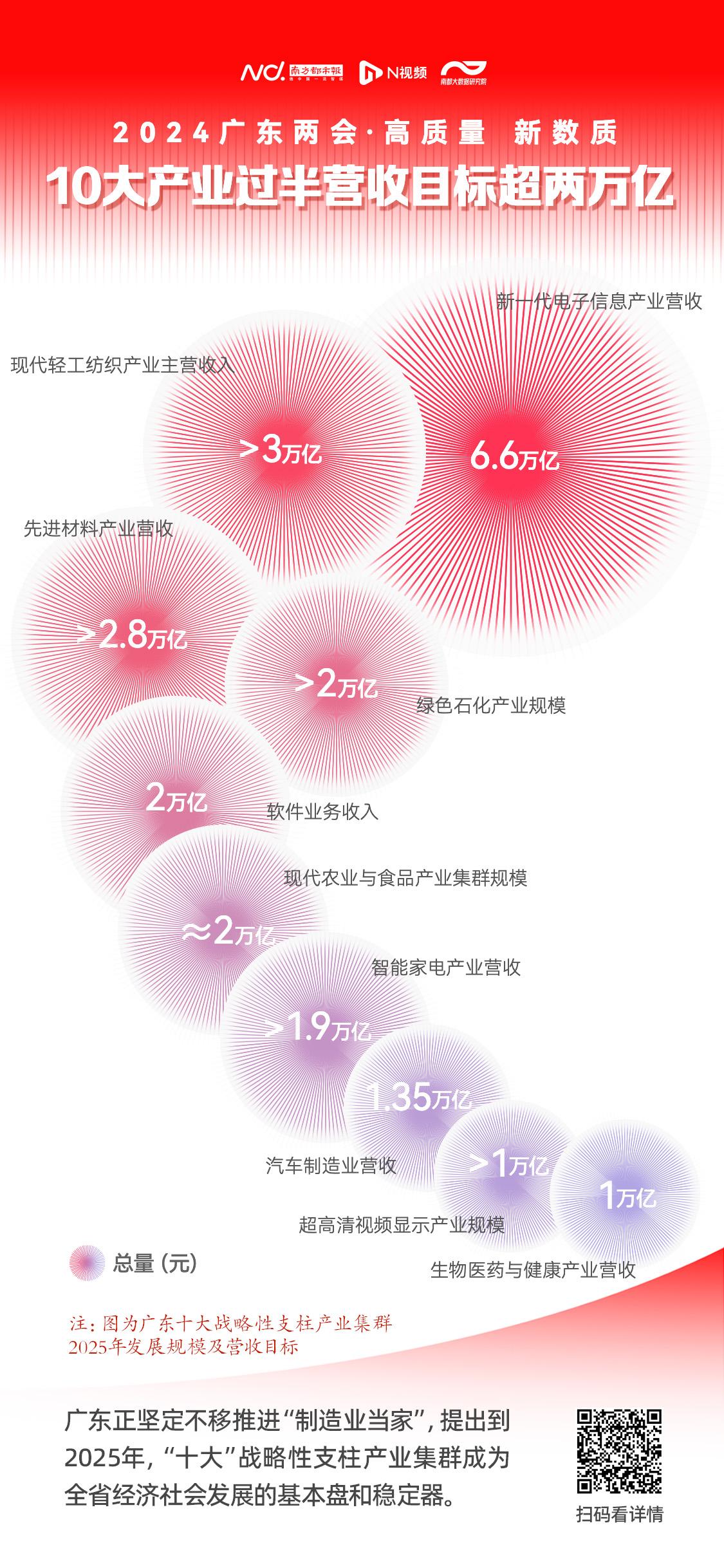 战略性支柱产业是广东制造的稳定器。南都大数据研究院梳理发现,广东10大战略性支柱产业中过半的2025年营收目标超两万亿,其中超高清视频显示产业、生物医药与健康产业营收将达到万亿元级别。