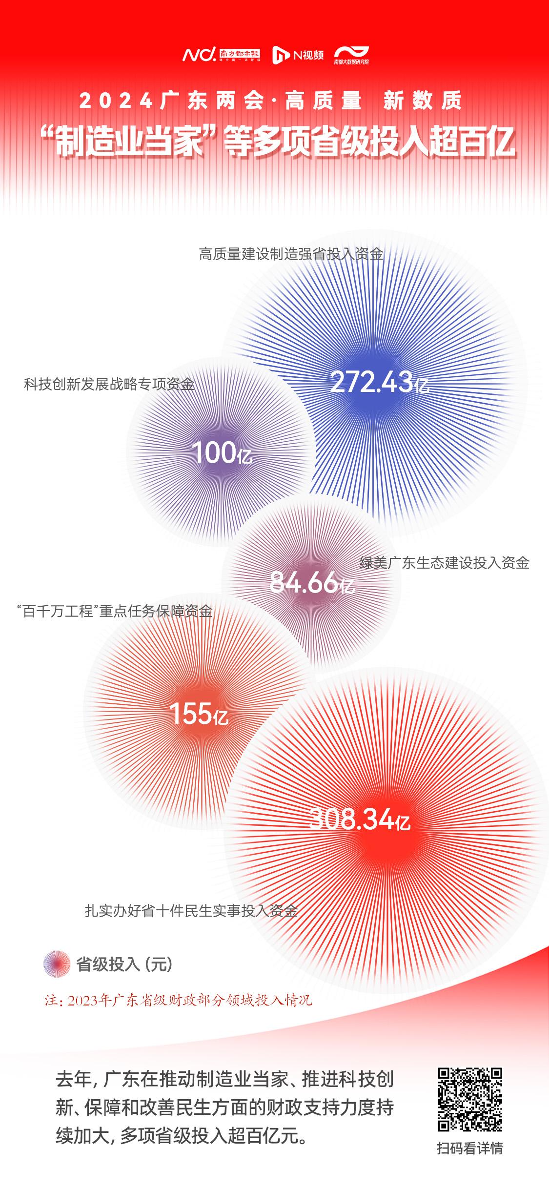 2023年,广东省持续加大在推动制造业当家、推进科技创新、保障和改善民生、提升“含绿量”等方面的财政支持力度,多项省级投入超百万,有力支撑经济社会发展大局稳定。