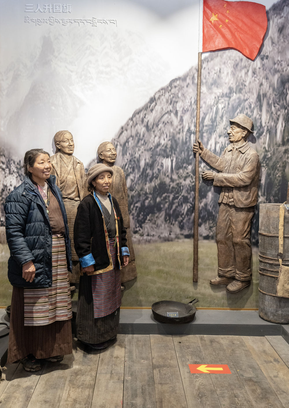 2023年6月10日,卓嘎(右)和央宗在桑杰曲巴故居中与描绘桑杰曲巴用自己缝制的国旗举行升旗仪式场景的壁画前合影。新华社记者费茂华摄
