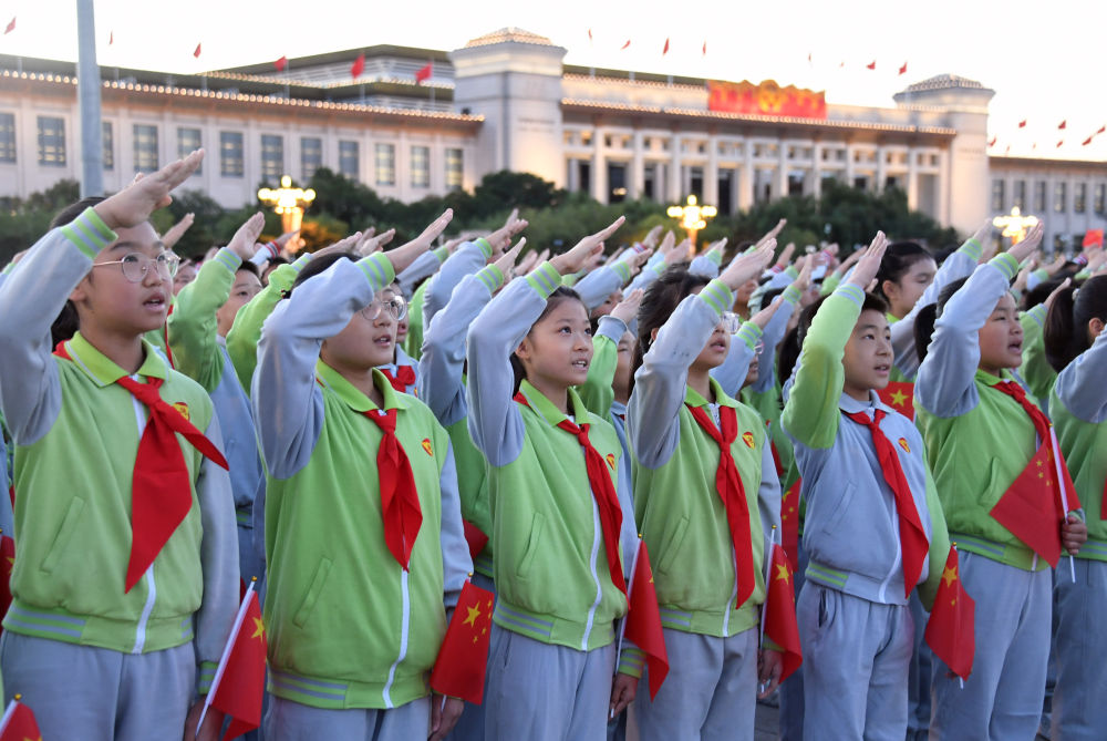 10月1日清晨,隆重的升国旗仪式在北京天安门广场举行,庆祝中华人民共和国成立75周年。这是少先队员向国旗敬礼。新华社记者任超摄