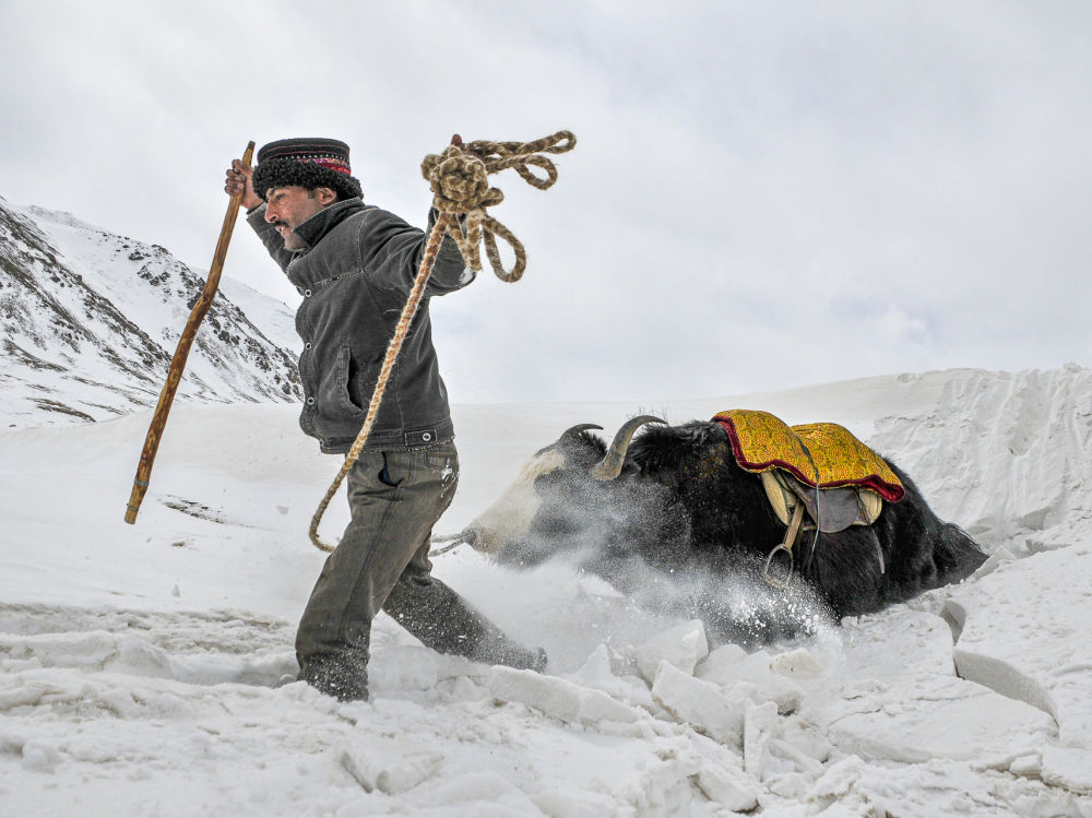 2009年3月6日,拉齐尼牵着牦牛踏着厚厚的积雪在边境线上巡逻。新华社发(王烈摄)