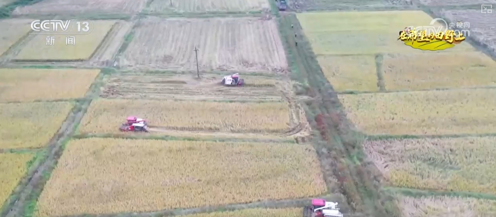 在江西宜春,多台大型收割机在农田里全程机械化作业,抢收秋粮,确保颗粒归仓。