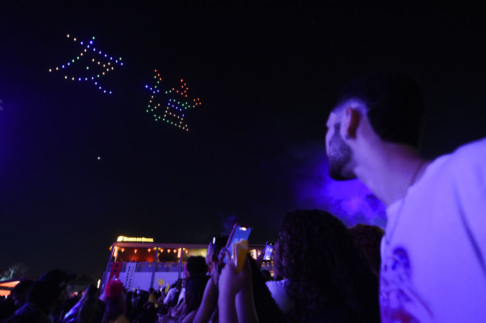 2024年8月17日,在巴西首都巴西利亚,人们在沙滩艺术节中国日活动上观看无人机表演。