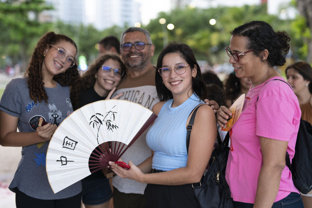 2024年2月3日,一名女子在巴西累西腓举行的中国春节庆祝活动上展示自己书写的扇面。