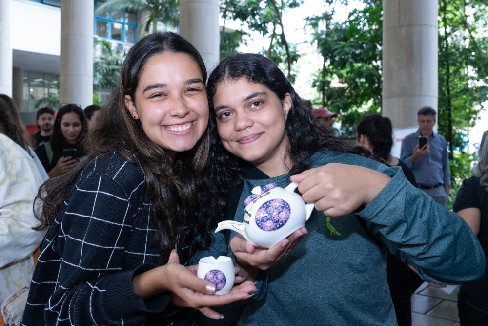 2024年4月18日,在巴西里约热内卢举行的联合国中文日活动上,巴西学生手持中国工艺品合影。