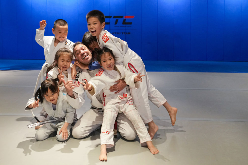 2023年4月7日,在北京一家格斗馆内,巴西柔术教练席尔瓦(中)在一堂柔术课结束后与学生们合影留念。为了更好地了解中国和传统武术,席尔瓦于2016年来到北京,在一家格斗馆担任巴西柔术教练。