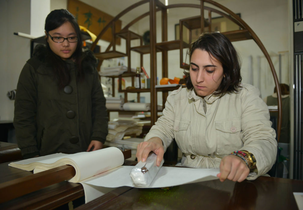 2012年12月20日,巴西留学生玛丽安娜(右)在杭州一家艺术馆体验传统木版水印技艺。