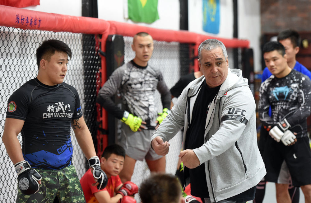 2019年11月6日,来自巴西里约热内卢的柔术教练鲁伊·梅内赛斯在北京一家搏击馆讲解动作要领。