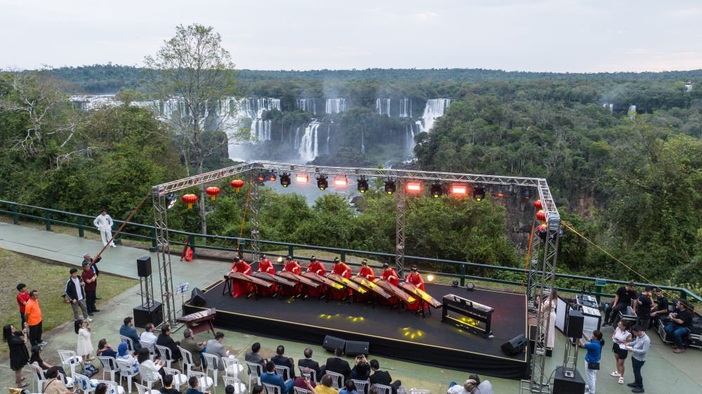 2023年9月29日,演员在巴西伊瓜苏瀑布前举行的中秋晚会上演奏古筝,庆祝中国传统节日中秋佳节。