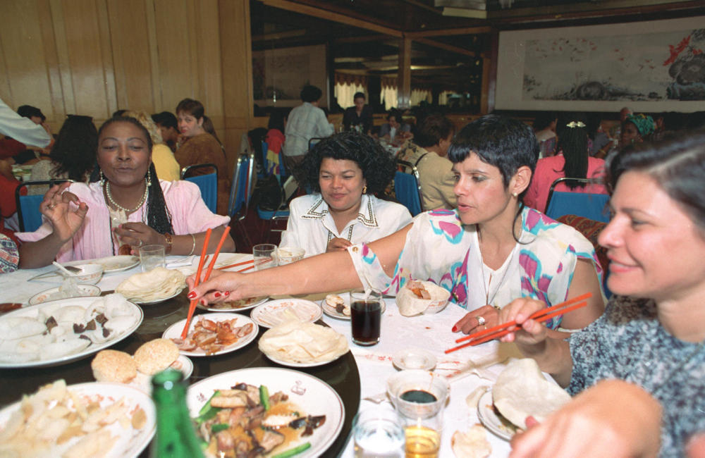 1995年9月10日,来华参加世界妇女大会的巴西代表结伴来到北京和平门全聚德烤鸭店,品尝北京烤鸭。