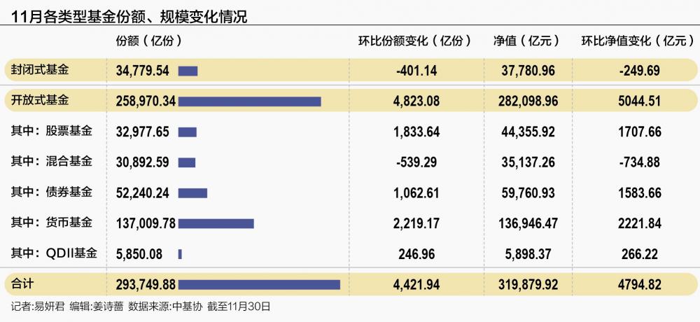 拆解来看,11月,公募基金的增量规模主要来自开放式基金中的股票基金、债券基金和货币基金。