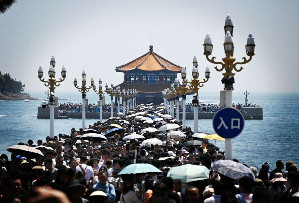 5月2日,游客在青岛市栈桥景区游玩。新华社记者李紫恒摄