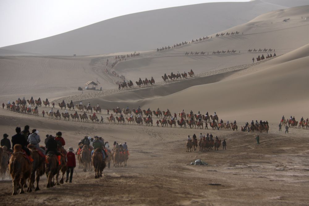 5月4日,游客在甘肃省敦煌市鸣沙山月牙泉景区游览。新华社发(张晓亮摄)