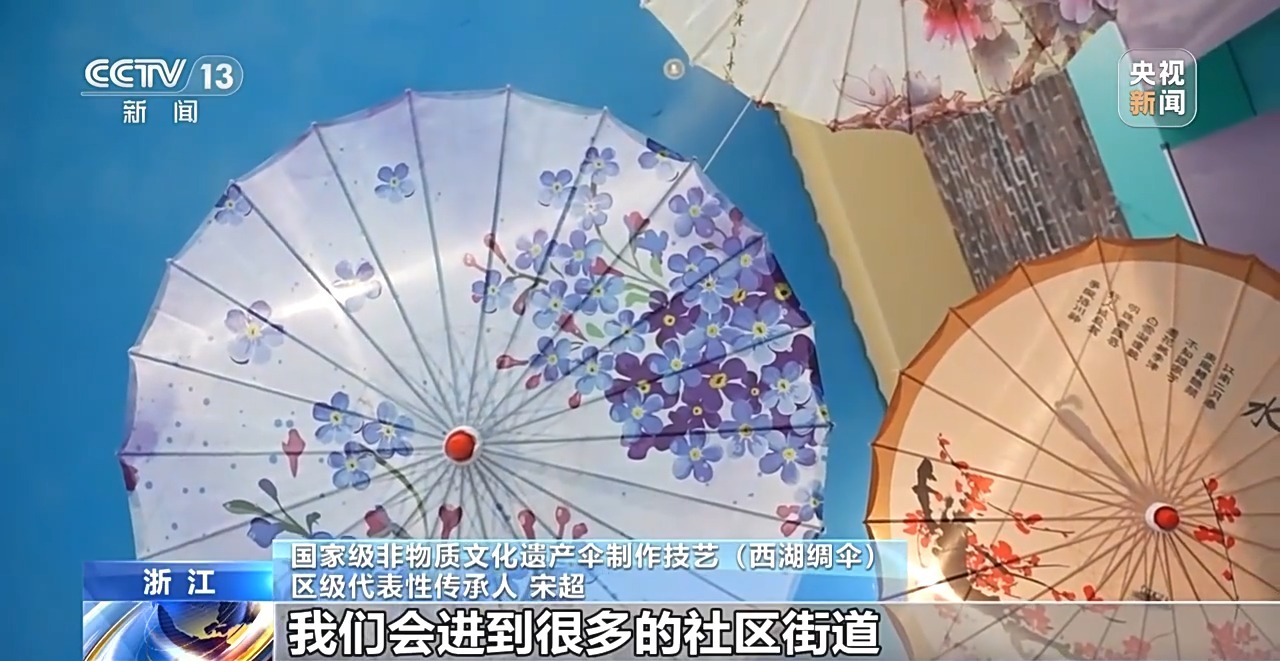 国家级非物质文化遗产伞制作技艺(西湖绸伞)区级代表性传承人宋超:我们会进到很多的社区街道,我们会进到中小学的校园、博物馆、非遗展示馆等等这样的地方,去进行我们西湖绸伞技艺的展示展览,包括各种各样的体验活动,以此让更多人了解和认识到我们西湖绸伞这项技艺。