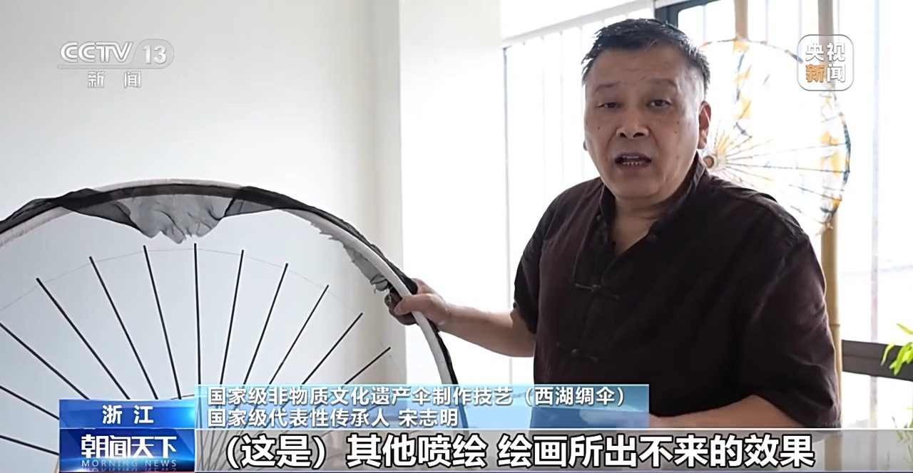 国家级非物质文化遗产伞制作技艺(西湖绸伞)国家级代表性传承人宋志明:丝绸是夹在中间的,我们的伞面是夹在中间,所以说收拢你是看不到伞面的,这个是独一无二的。