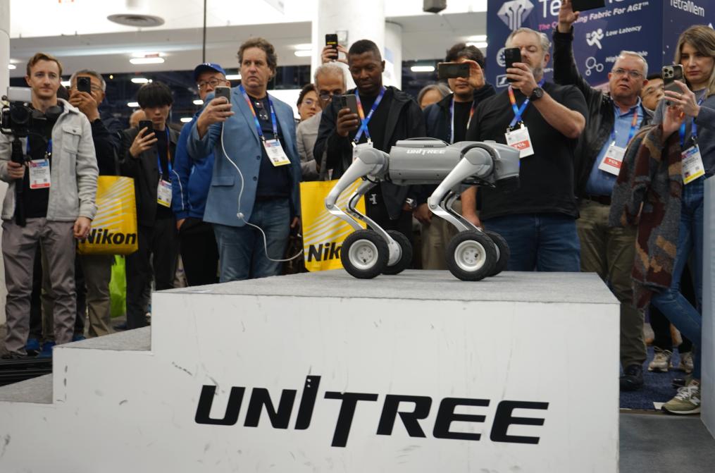 2025年1月8日,在2025年美国拉斯维加斯消费电子展(CES)上,人们在中国企业宇树科技的展区观看机器狗展示。新华社发(曾慧摄)
