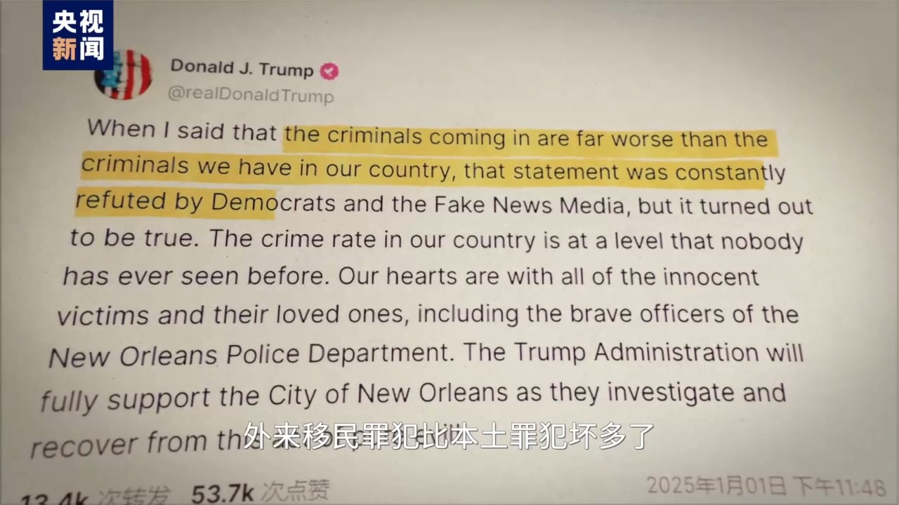 对于美国民众的安全关切,候任总统特朗普当天回应称:“事实证明外来移民罪犯比本土罪犯坏多了,民主党却不承认。”特朗普的儿子也发文称:“这是拜登给美国的分手礼——移民恐怖分子。”