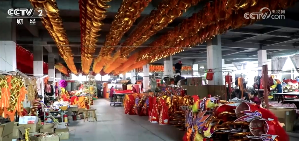 在江西南昌青云谱区的一家龙灯生产基地,数百平方米的厂房内设置了龙头、龙身、龙衣、龙尾等制作区域,50多名工人都在有条不紊地作业。在发货区,师傅们忙着按订单装货打包。