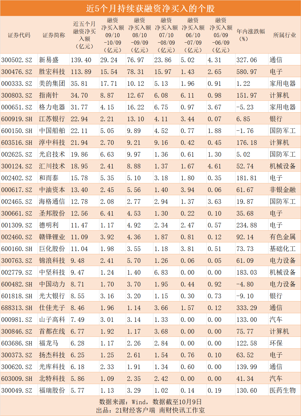 从融资客近几个月的加仓情况来看,截至10月9日,按月度计算,连续3个月获融资净买入的个股有103只;连续5个月获融资净买入的有29只,其中新易盛、胜宏科技等2只个股近5个月的融资净买入总额超过100亿元,美的集团、指南针、格力电器等3只个股的融资净买入总额超过30亿元。