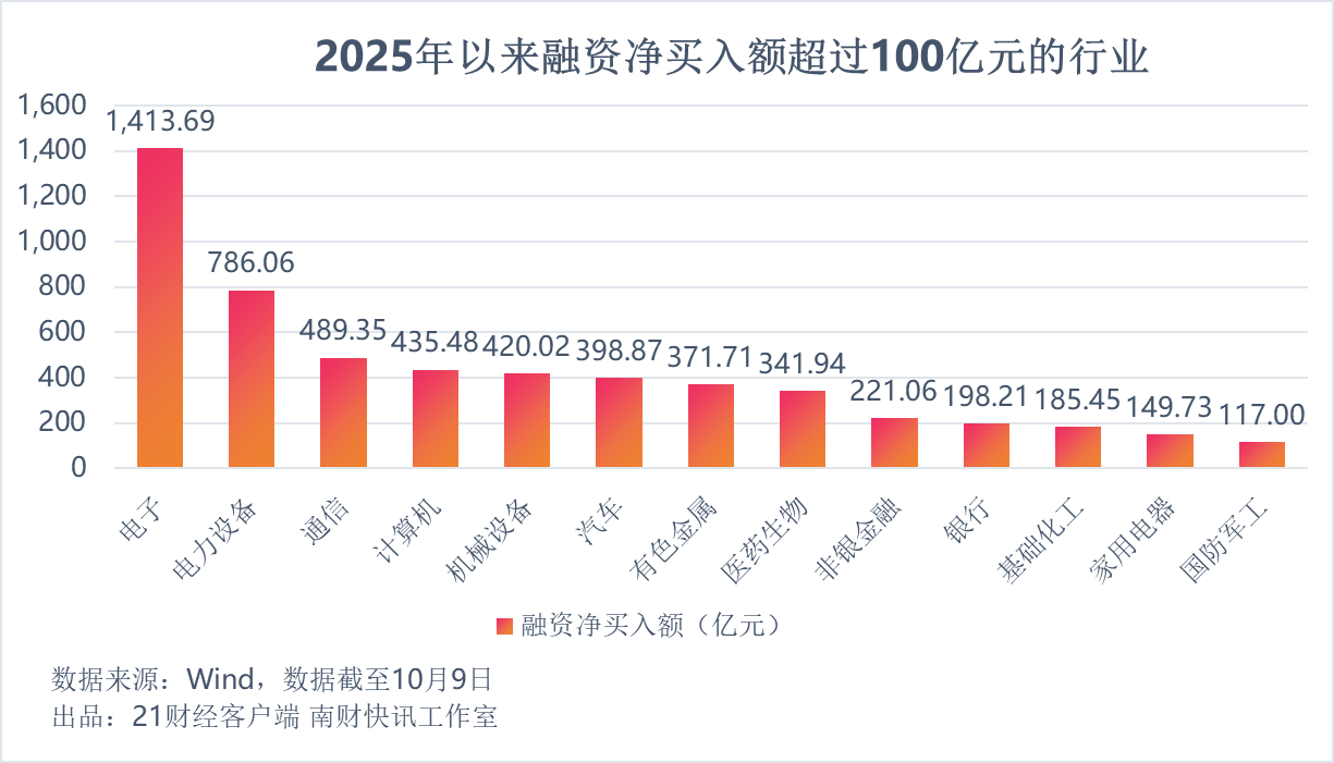 截至10月9日,今年以来有13个行业获融资净买入超100亿元,其中电子行业以1413.69亿元的融资净买入额位列第一,此外电力设备、通信、计算机、机械设备、汽车、有色金属、医药生物等行业均位居前列。