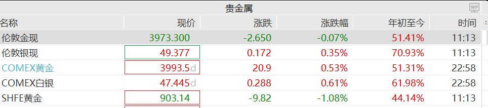 10月10日,截至11:11,现货黄金跌破4000美元/盎司关口,最新报3973.3美元/盎司,日内跌0.07%;COMEX黄金期货主力最新报3993.5美元/盎司,日内涨0.53%。