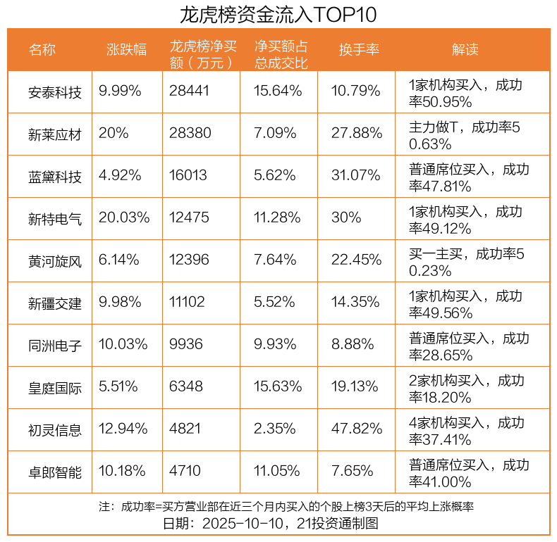 10月10日,上证指数下跌0.94%,深证成指下跌2.7%,创业板指下跌4.55%。盘后龙虎榜数据显示,共有51只个股因当日异动登上龙虎榜,资金净流入最多的是安泰科技(000969.SZ),达2.84亿元。