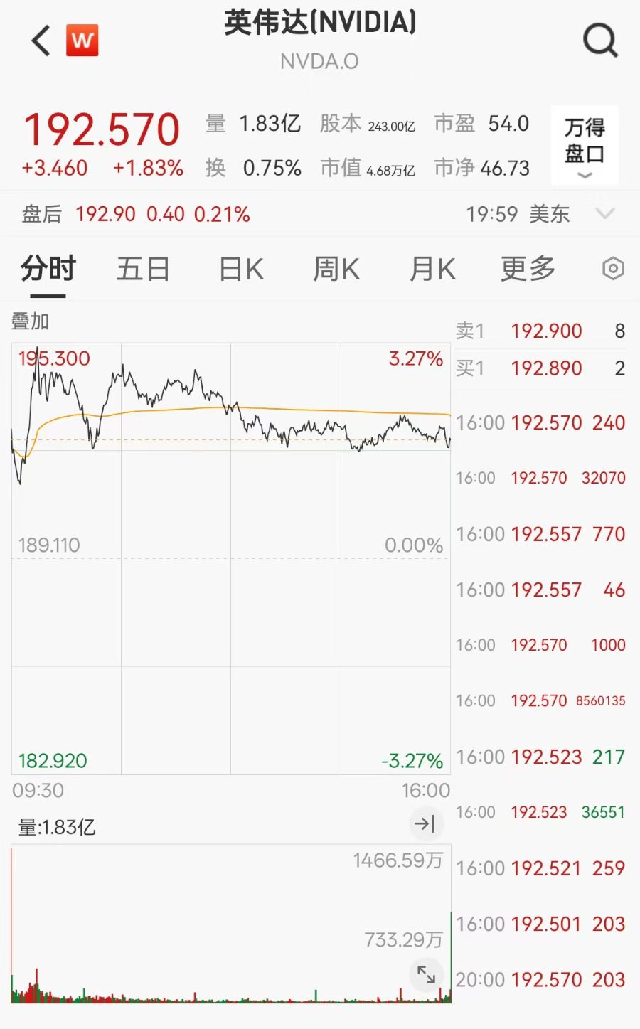 英伟达股价创历史新高,收盘上涨1.83%,最新市值为46778亿美元。