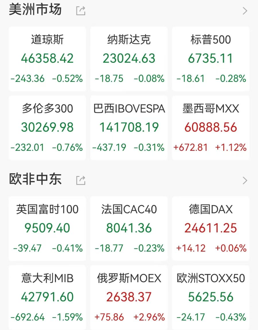 当地时间10月9日,美股三大指数全线收跌,热门科技股普涨跌不一,甲骨文涨超3%,Meta涨超2%,苹果、谷歌跌超1%。