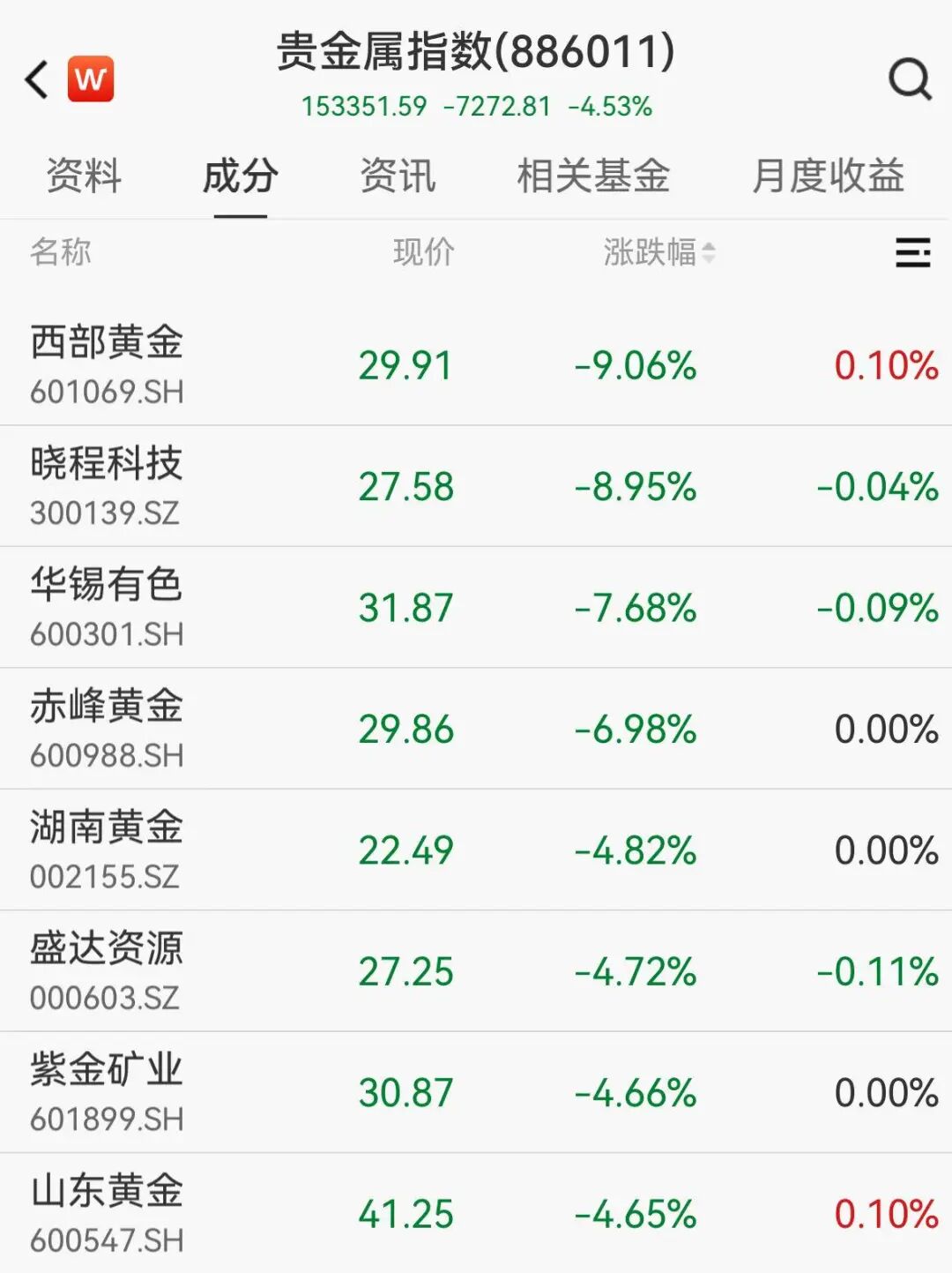10月10日,现货黄金跌破4000美元关口。截至15时,跌幅略微收窄,最新价格报3965美元/盎司。A股贵金属板块也出现下挫,截至收盘,西部黄金、赤峰黄金等多只个股跌超5%。