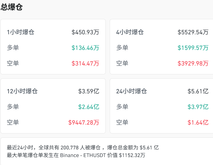 Coinglass数据显示,过去24小时内,加密货币市场又有20多万人爆仓,爆仓金额达到5.61亿美元,其中超70%为多单爆仓。