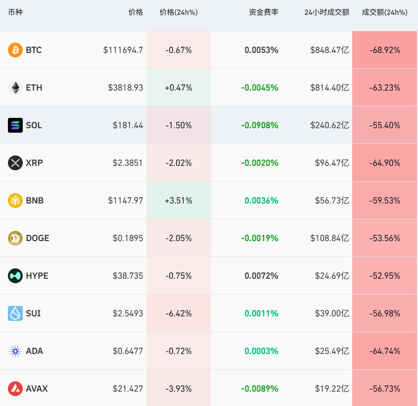10月12日,加密货币继续跳水,比特币一度跌破11万美元关口,Solana、以太坊、BNB、XRP等纷纷跟跌。截至12日14:19,近24小时内加密货币主要币种成交额跌幅多在50%~70%之间,持仓额大幅下行,其中比特币成交额下跌近70%。