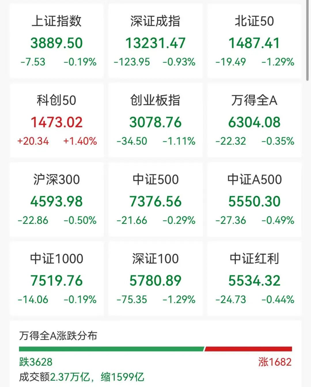 10月13日,A股市场全天震荡回升,截至收盘,沪指跌0.19%,深成指跌0.93%,创业板指跌1.11%。沪深两市成交额2.37万亿元,较上一个交易日缩量1599亿元。
