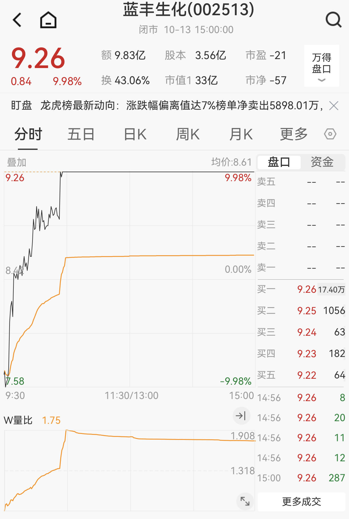 值得注意到是,*ST沐邦、*ST亚太、蓝丰生化、*ST宇顺等多股盘中上演“地天板”。以蓝丰生化为例,该股早盘跌停,午间收盘前突然直线拉升封板,截至收盘,封板金额达1.61亿元。此前蓝丰生化经历七连涨停后连续两日跌停,波动剧烈。