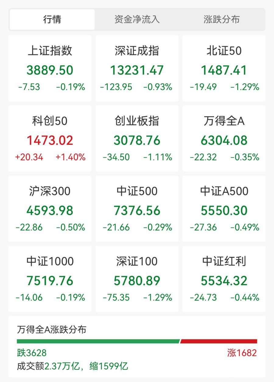10月13日,A股上演“深V”反转行情。早盘三大指数一度重挫,沪指低开2.49%,深成指跌3.88%,创业板指跌4.44%;但午后资金回流,指数跌幅显著收窄,沪指一度接近平盘,科创50指数逆势翻红。截至收盘,沪指跌0.19%,深成指跌0.93%,创业板指跌1.11%,科创50指数涨1.4%。今日成交额2.37万亿元,虽缩量1599亿元,但仍处历史高位。