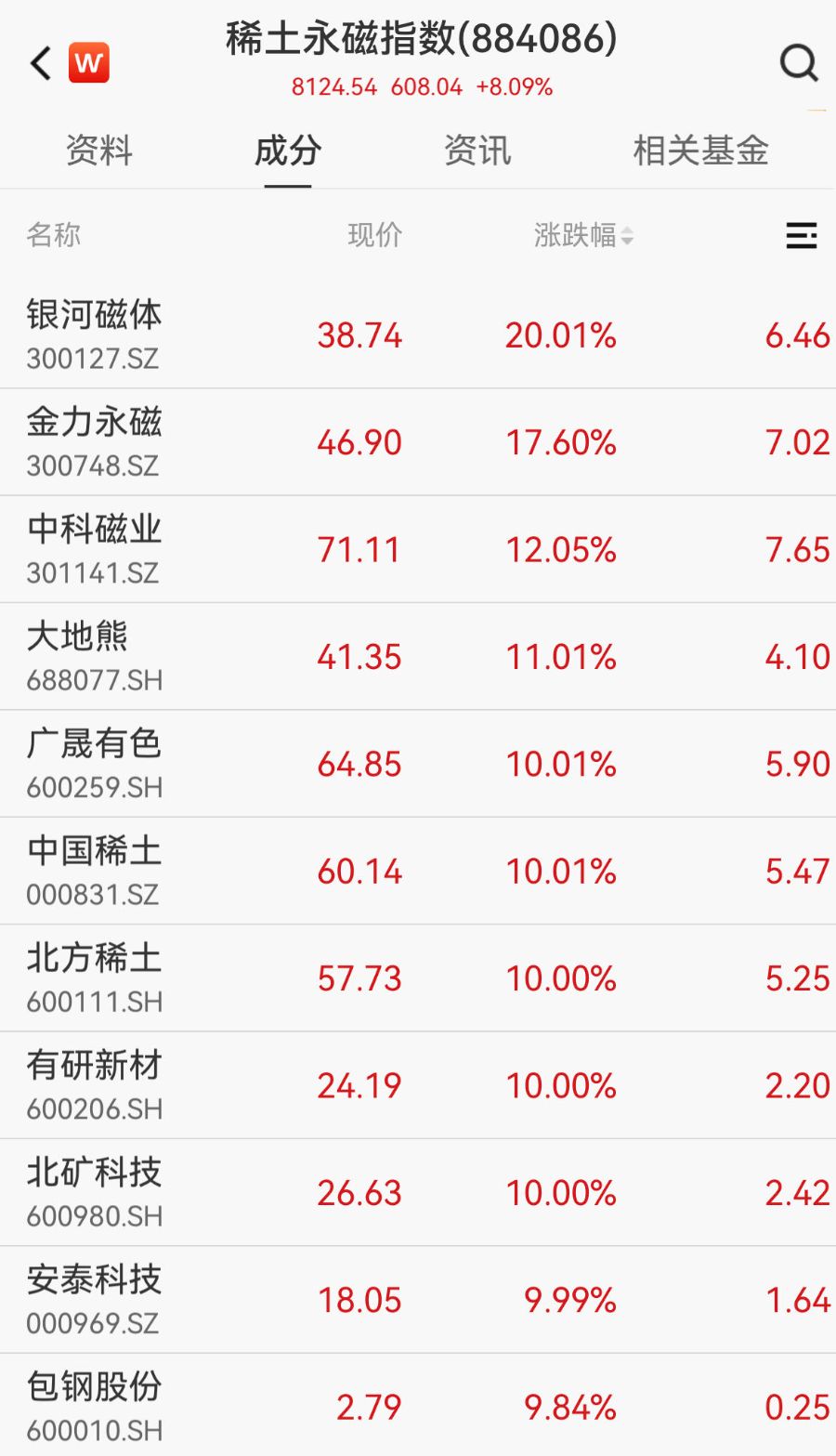 板块层面,稀土永磁板块今日大涨,银河磁体、广晟有色、中国稀土、北方稀土、有研新材等多股涨停,金力永磁、中科磁业等多股涨幅超10%。