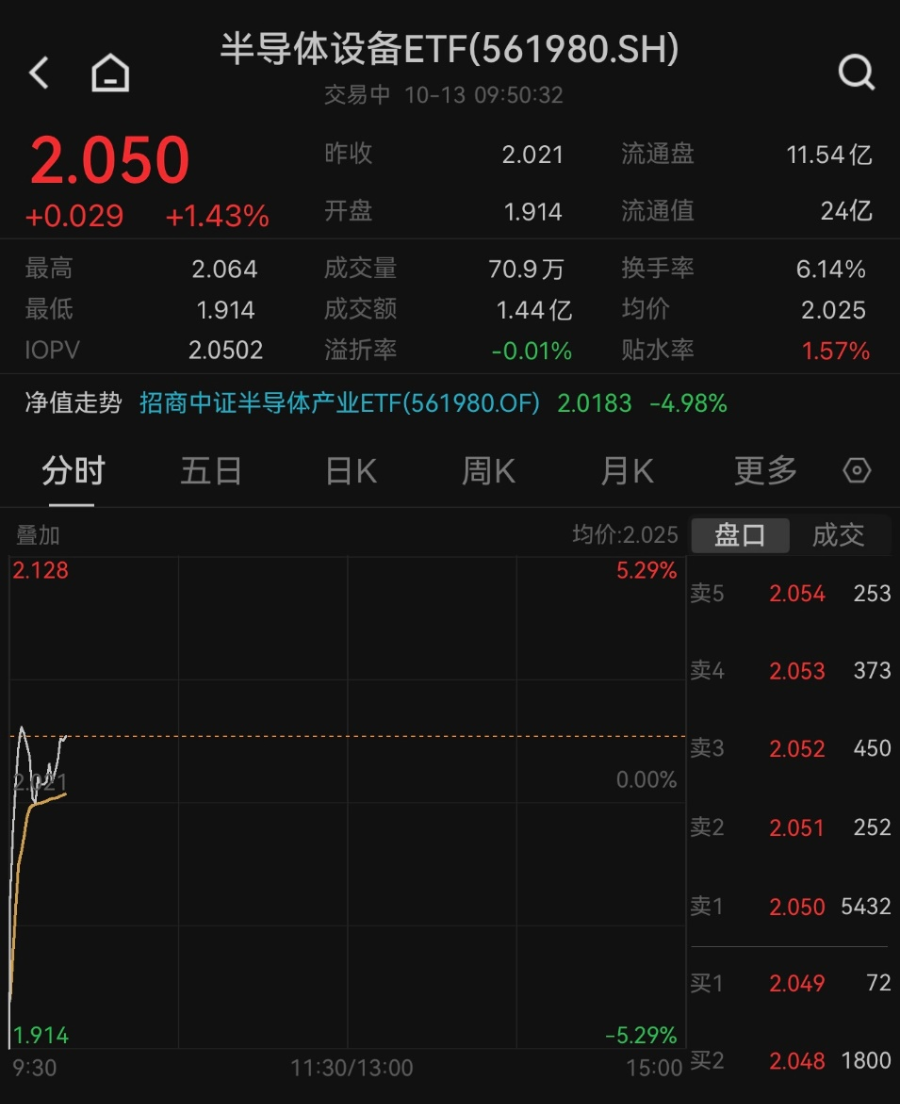 10月13日,A股三大股指悉数大幅低开。盘面上,半导体板块开盘下跌 ,盘中板块有所拉升。半导体设备ETF(561980)盘中一度翻红涨幅达1.43%,成交额逼近1.5亿元。