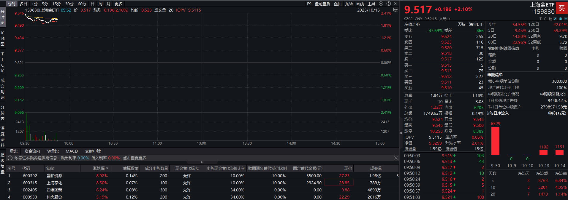 此外,核心宽基ETF中,中证A500ETF天弘(159360)走势震荡,截至发稿上涨0.16%。成分股中,盛和资源涨超9%,上海家化、烽火通信、信维通信、四维图新、神火股份等股跟涨。