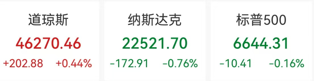 10月14日,美股三大指数收盘涨跌不一,道指涨0.44%报46270.46点,标普500指数跌0.16%报6644.31点,纳指跌0.76%报22521.7点。