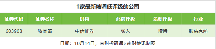 评级调低方面,10月14日,券商调低1家上市公司评级,中信证券对牧高笛的评级从“买入”调低至“增持”。