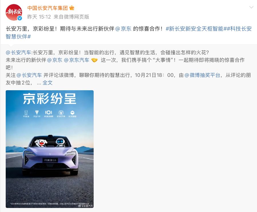 此次京东官宣新车时,中国长安汽车集团更是第一时间送上祝贺。