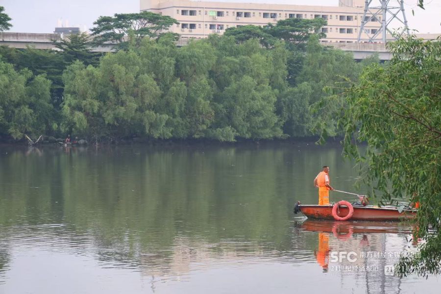 (水清岸绿的茅洲河和打捞作业中的工作人员。 本报记者梁信/摄)