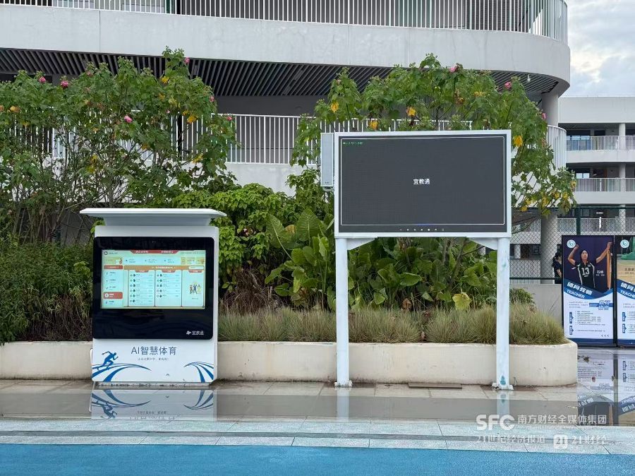 (操场边上的AI智慧体育电子屏。 本报记者梁信/摄)