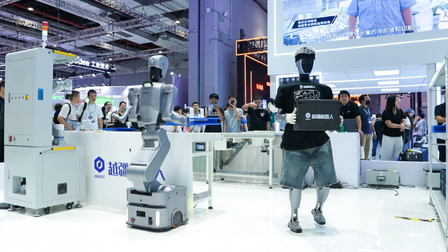 (图为越疆科技双足人形机器人Dobot Atom和轮式人形机器人ATOM-M在工厂场景里搭配干活)