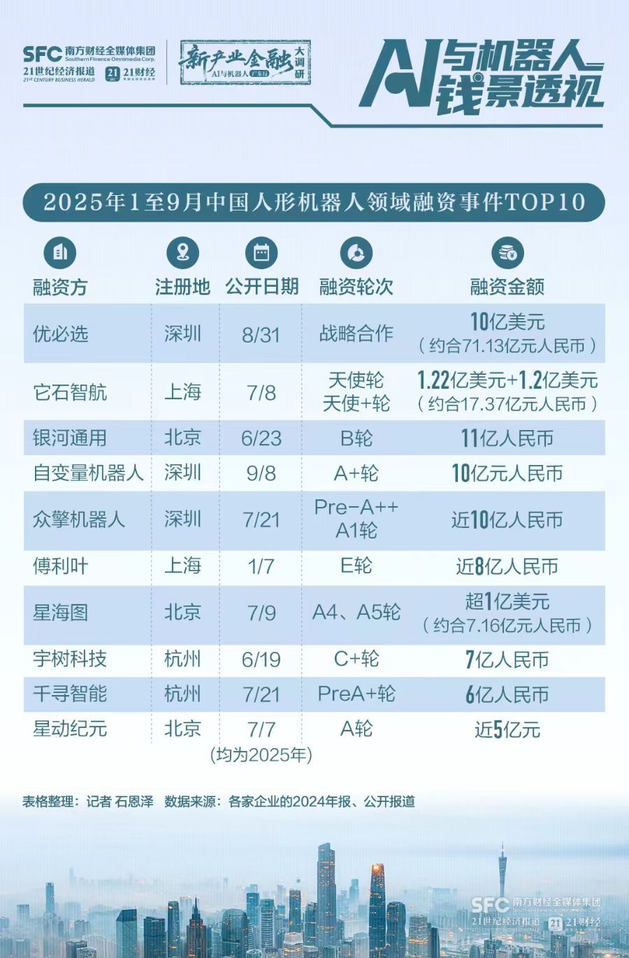而广东机器人产业发展相较于北京和上海,较为均衡,实际上中腰部企业偏多。据21世纪经济报道记者统计,2025年1至9月中国人形机器人融资事件TOP10里面,广东企业有3家,分别是优必选、众擎机器人和自变量机器人。