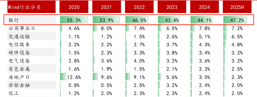 在险资持仓中,银行业占比始终最高。根据中泰证券统计,2025年上半年为47.2%,其次为公用事业、交通运输,占比分别为7.2%、6.5%;相比2024年底持仓占比进一步提升3.1pct。