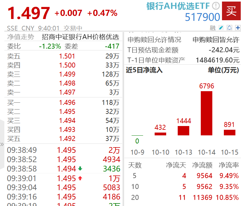 二级市场上,资金借道相关ETF布局。截至10月15日,市场唯一跟踪中证银行AH价格优选指数的ETF——银行AH优选ETF(517900)已连续4日获资金净流入,累计“吸金”近1亿元。