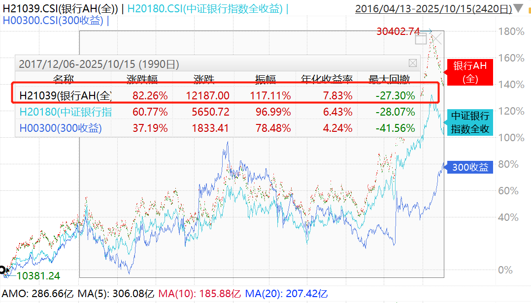 自2017年12月6日指数发布以来,银行AH全收益指数累计涨82.26%,同期中证银行全收益指数涨60.77%,相对超额收益21.49%。